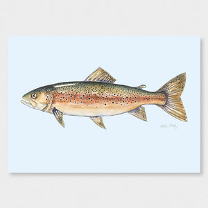 A detailed watercolour of a tarauta / brown trout, capturing the subtle textures and earthy tones of this freshwater favourite. The light blue background creating some depth and swimming vibes for Bas the Brown Trout.