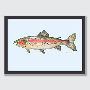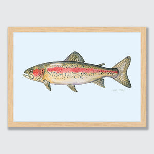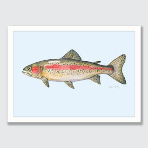 A detailed watercolour of a rainbow trout / tarauta, showcasing its iridescent pink stripe, speckled flanks and graceful movement through Aotearoa’s freshwater rivers and lakes. The light blue background creating some depth and swimming vibes for Ron the Rainbow Trout.