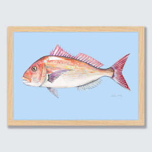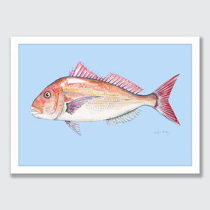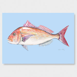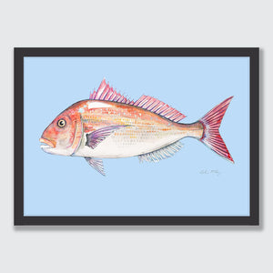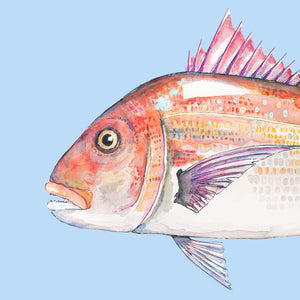 A detailed watercolour of a tāmure / snapper, featuring its rosy-pink scales, spiky dorsal fin and that unmistakable Aotearoa shimmer. The ocean blue background creating some depth and swimming vibes for this snapper.
