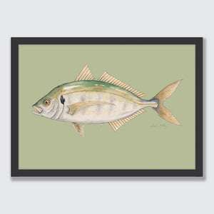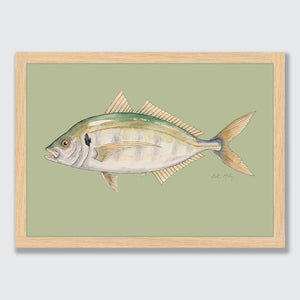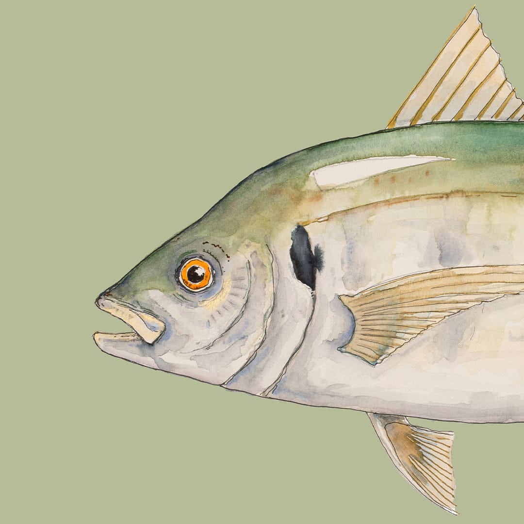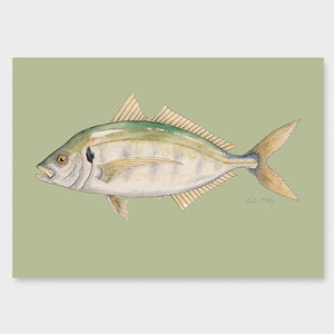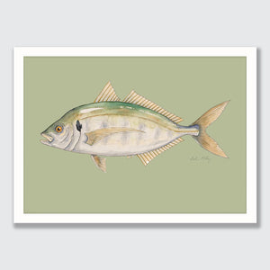 A detailed watercolour of a Araara / Trevally, showcasing distinctive green and blue colouration. Known for being a powerful, quick sport fish and found in Aotearoa’s northern waters. The light green background creating some depth and inner harbour swimming vibes for Trevor the Trevally.