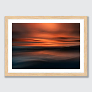 A tranquil seascape that captures the fleeting intensity of sunset as it dissolves into the calm of open water. Layers of molten light meet deepening blues, reflecting the quiet balance between energy and stillness found only at sea.