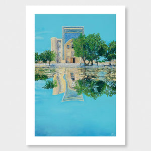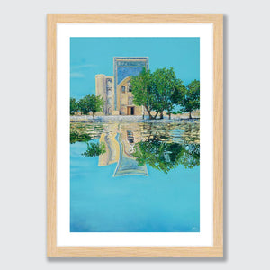 A detailed painting of Lyab-i-Hauz in Bukhara, Uzbekistan. Featuring rich blues and ornate architecture.
