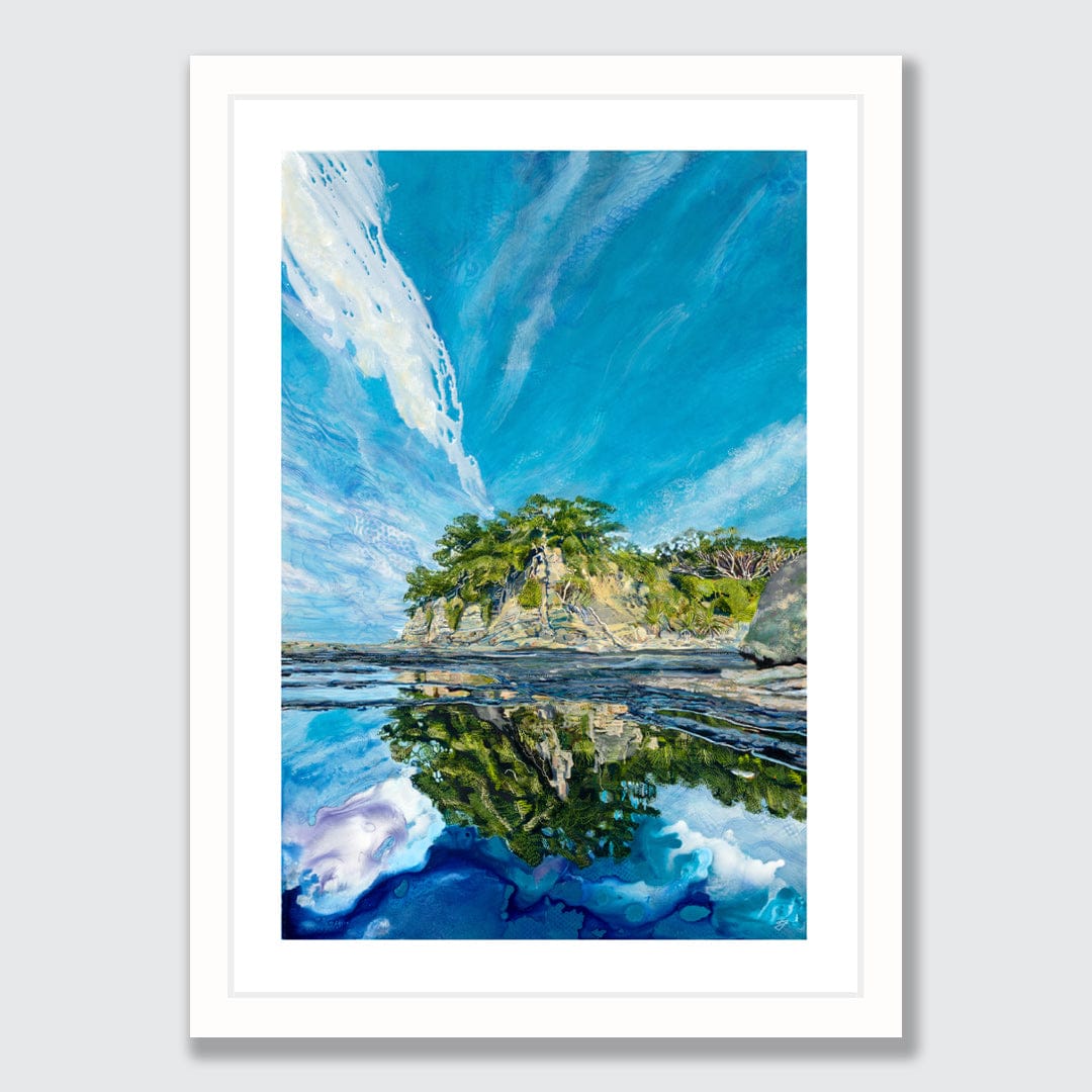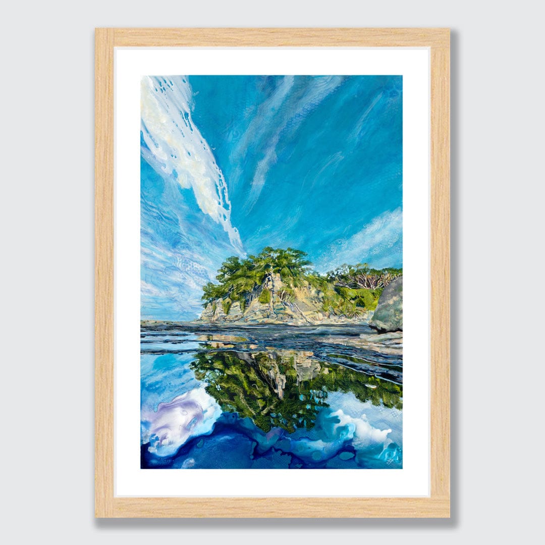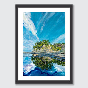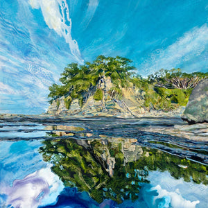 A detailed painting of Omaha Heads, standing in the shallows and gazing down the beach, where vibrant blues and sweeping clouds shape the sky.