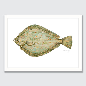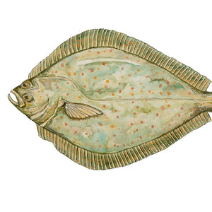 A detailed watercolour of a Pātiki / Flounder, showcasing sandy, green hues and orange speckles. Known for their flat body and camouflaging abilities, “chameleons of the sea”.