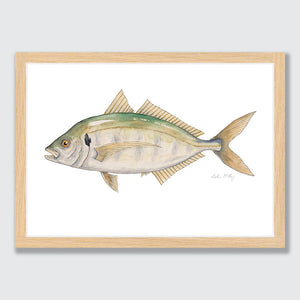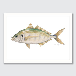 A detailed watercolour of a Araara / Trevally, showcasing distinctive green and blue colouration. Known for being powerful and quick sport fish, found in Aotearoa’s northern waters.