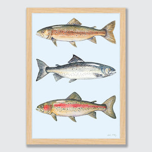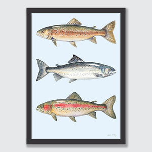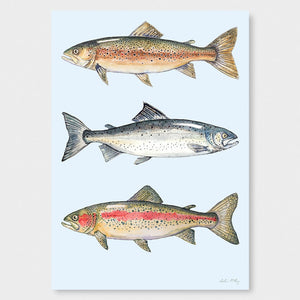 A detailed watercolour of a tarauta/brown trout, hāmana/salmon and rainbow trout/tarauta, capturing the subtle textures and earthy tones of these freshwater favourites.