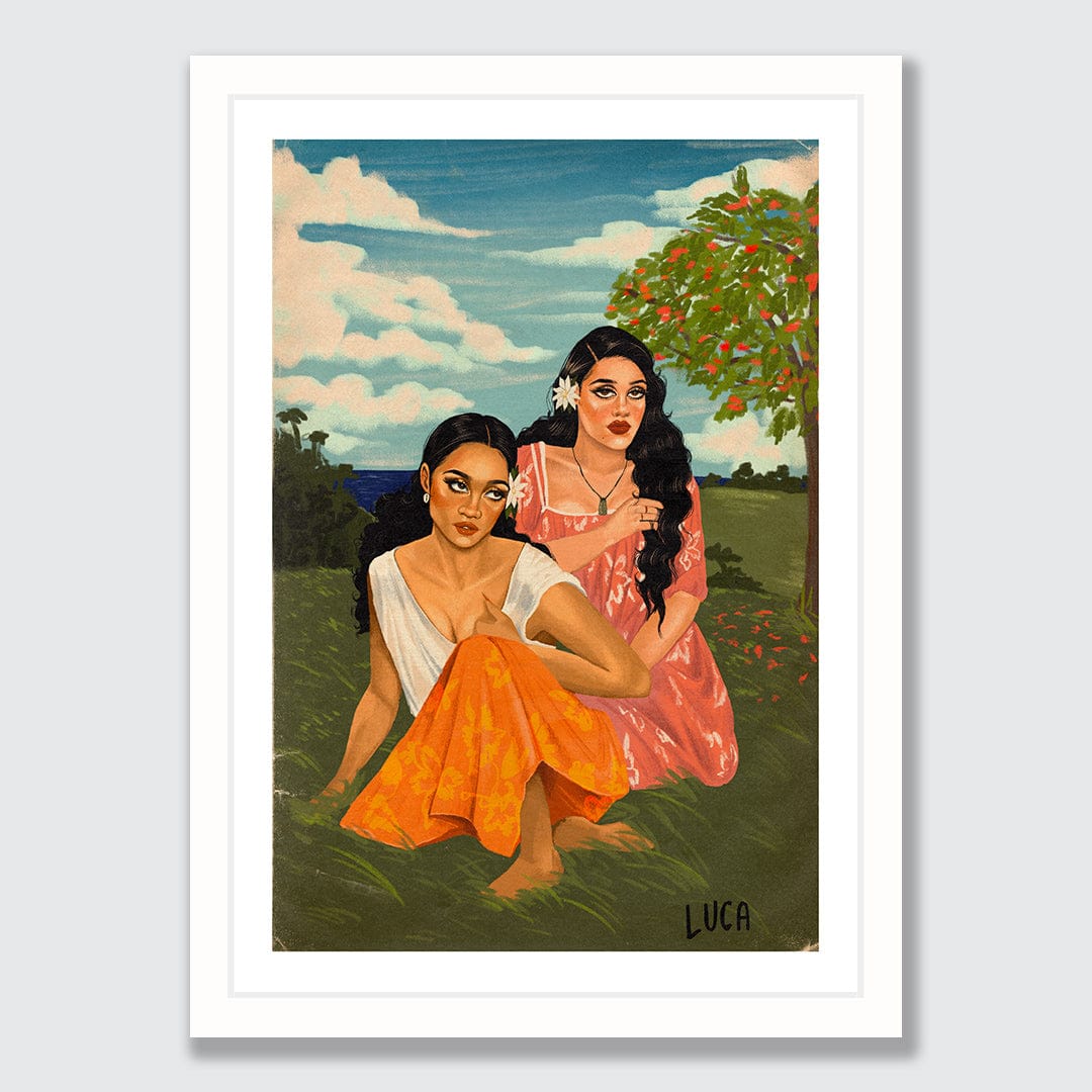 Tamarinds & Tiare is a reworking of a piece by Gauguin, a french artist living in Tahiti in the late 19th early 20th century. Luca saw a piece of his with this same pose in a cafe as a child whilst living in Tonga and has been inspired ever since.