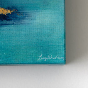 Veil is an abstract painting made up of layered bright teals, deep navy, and a hint of plumy purple. Lucy’s signature gold leafing draws the eye and creates a sharp contrast against the surrounding inky tones.