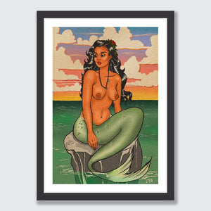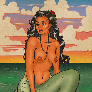 Aulola translates to ‘the dawn’ and is a full circle moment for Luca due to a childhood spent drawing mermaids, in this piece it depicts Aulola’s ritual of surfacing every morning to sit on her favourite rock just to catch the sunrise and to feel the sun on her skin.