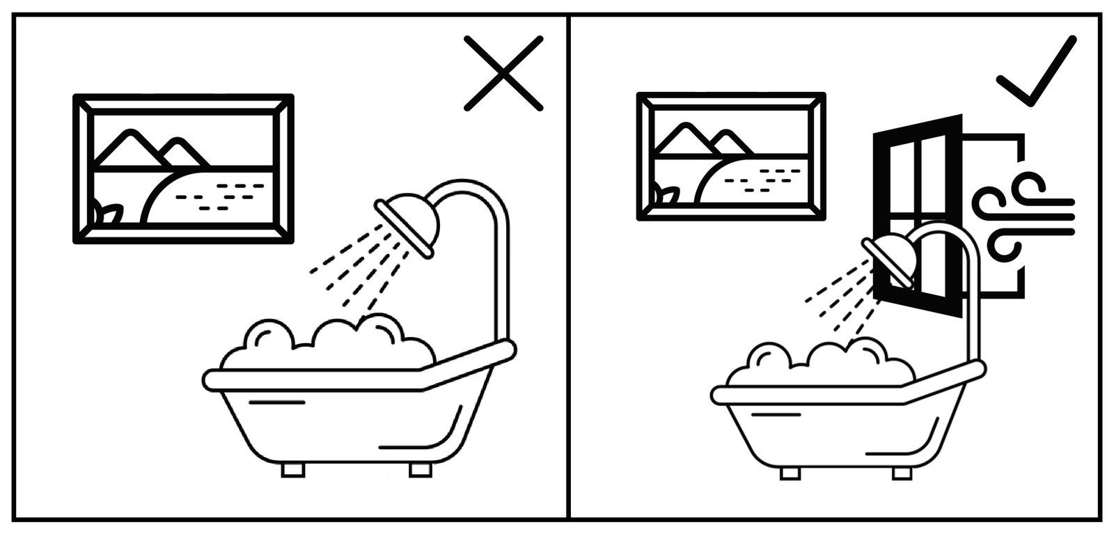 Avoid hanging your art in humid rooms such as bathrooms, unless it is very well ventilated.