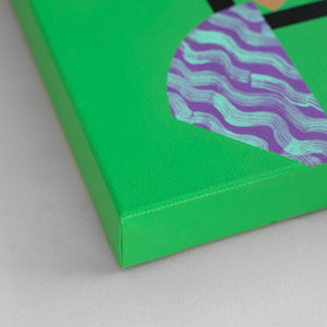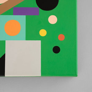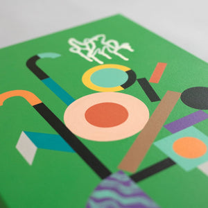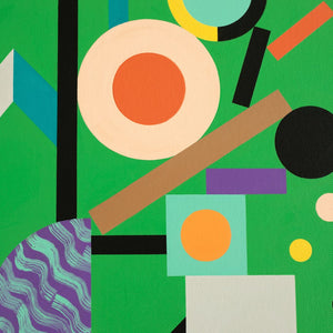 'Nom de Plume' is a striking jade green piece that blends bold geometric shapes with playful, fluid squiggles. Its energetic colour palette remind us of a box of popping candy.