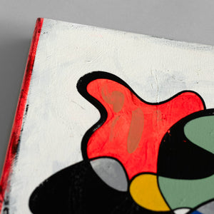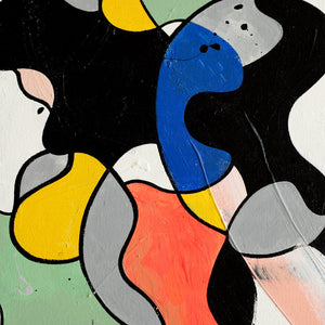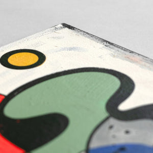This bright original features a slightly textured background and neon pink paint. The overlapping shapes and contrasting colours fill the canvas in a classic 80's fashion.